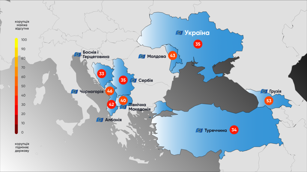 Зазначається, що показники більшості країн-кандидаток в Євросоюз також мають тенденції до стагнації в боротьбі з корупцією.